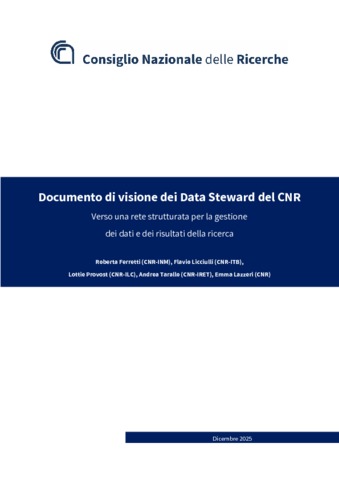 Ferretti, Roberta and Licciulli, Flavio and Provost, Lottie and Tarallo, Andrea and Lazzeri, Emma Documento di visione dei Data Steward del CNR. Verso una rete strutturata per la gestione dei dati e dei risultati della ricerca. Technical Report. CNR. (Unpublished)